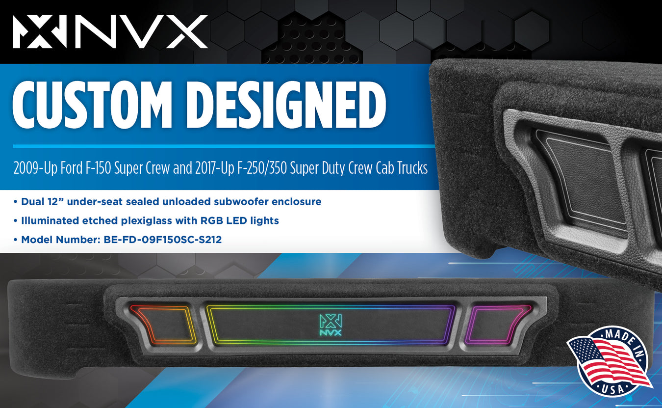 Custom Dual 12" Under-seat Sealed Unloaded Subwoofer Enclosure with LED Lighting for 2009-Up Ford F-150 Super Crew and 2017-Up F-250/350 Super Duty Crew Cab Trucks | BE-FD-09F150SC-S212