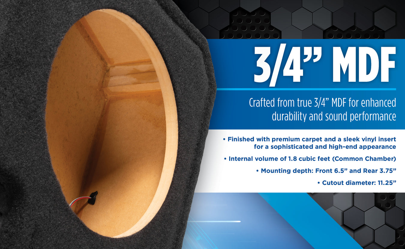 • Crafted from 3/4" MDF (Medium Density Fiberboard) for enhanced durability and sound performance.