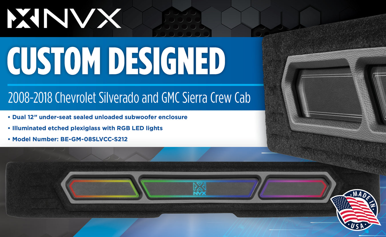 Custom Dual 12" Under-seat Sealed Unloaded Subwoofer Enclosure with LED Lighting for 2008-2018 Chevrolet Silverado and GMC Sierra Crew Cab Trucks | BE-GM-08SLVCC-S212