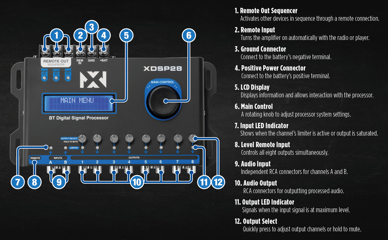 The XDSP28, an automotive DSP audio processor from NVX, is groundbreaking in car audio market, being theΒ first of its kind to feature a Remote Level Controller. This unique addition enablesΒ simultaneous control of all eight outputs, offeringΒ unparalleled customization and control over your car's sound system. Designed withΒ 2 audio inputs and 8 independent outputs, it allows for the selection of audio sources (A, B, or A+B) for each output.