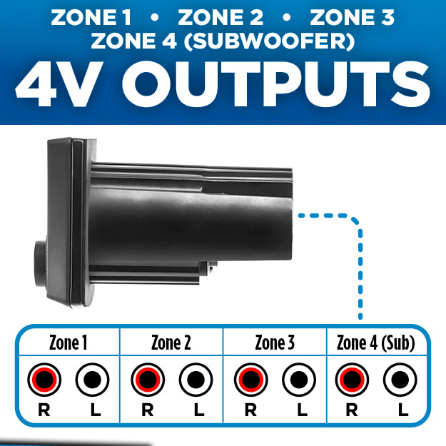 - 4 Sets of 4V preamp outputs (Zone 1, Zone 2, Zone 3 and Zone 4 subwoofer)