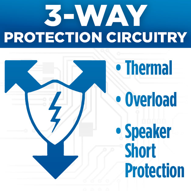 - 3-way protection circuitry (thermal, overload, and speaker short protection)